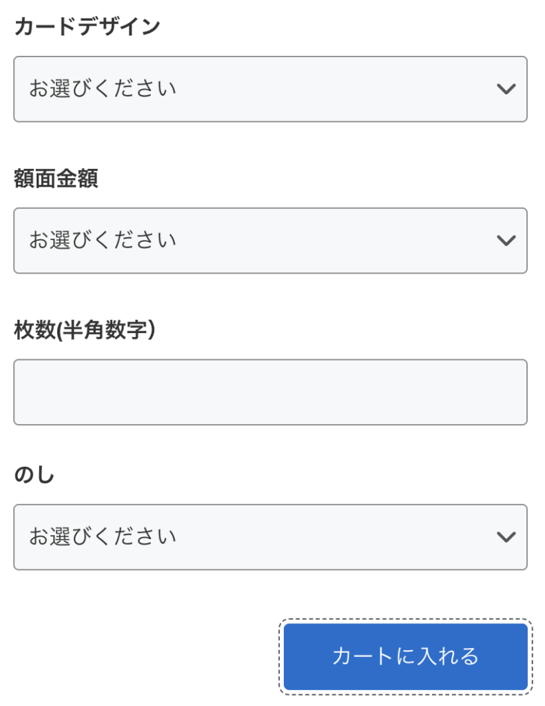 「カードデザイン」「額面金額(3,000円〜50,000円)」「枚数」「のしの希望」を入力または選択し、カートに入れ、決済したいカードと届ける先を指定すれば注文完了です!